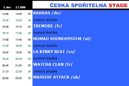 The Offspring (USA), Kaiser Chiefs (GB), Massive Attack (UK), Los de Abajo(MX), Helmet (USA), i0 (DE), Locos (SPA), Madball (USA), N.O.H.A .(DE), Outvile (UA), Skop (DE), Demented Are Go (GB), Dreadzone (GB), VNV Nation, Watcha Clan (FR), Park Avenue (IT), Karras (DE), Enter Shikary (GB), Black Mountain (CA), Donots (DE), Flogging Molly (USA), H2O (USA), Holy Fuck (CA), Penten Rococo, Kissmet, Zulu 9:30, La Kinky Beat.Aneta Langerová, Anna K, Atari Terror, Bára Zemanová, Bikini, Blue Effect, Bundy Ted, Clou, Cocotte Minute, Čankišou, Dark Gamballe, David Koller, Demented Are Go, Divokej Bill, Dreadzone, E!E, Eggnoise, Electrik Mann, Fourth Face, Gaia Mesiah, Gang ala Basta, Gipsy.cz, HC3, Horkýže slýže, Kabát, Karras, Khoiba, Kryštof, Landmine spring, Lavagance, Liguére, Maradona jazz, Medvěd 009, Mig 21, No Gravity, Nuck Norris, Outvile, Para, Park Avenue, Priesnitz, Prohrála v kartách, Psí vojáci, Rattle bucket, Skop, Skyline, Southpaw, Status Praesents, Sto Zvířat, Sunshine, Tatabojs, Temperamento, The Chancers, Tleskač, Tři sestry, UDG, United flavour, Už jsme doma, Vladimír Mišík & ETC & hosté, VNV Nation, Vypsaná fixa, Watcha clan, Wohnout, X Core, X Indl, Xavier Baumaxa, Znouzecnost, Žlutý pes, EMPYR, The Ghost, Indios Bravos, Montreal, Happysad Martin Gredner, Poprednny, Matt Hardwick, Tomas Haverlik, Roger Venzent, Cubik, Northern Lite LIVE, Weki djs, Joshek, Suki, Pixie, Aphrodite, Sayko a další